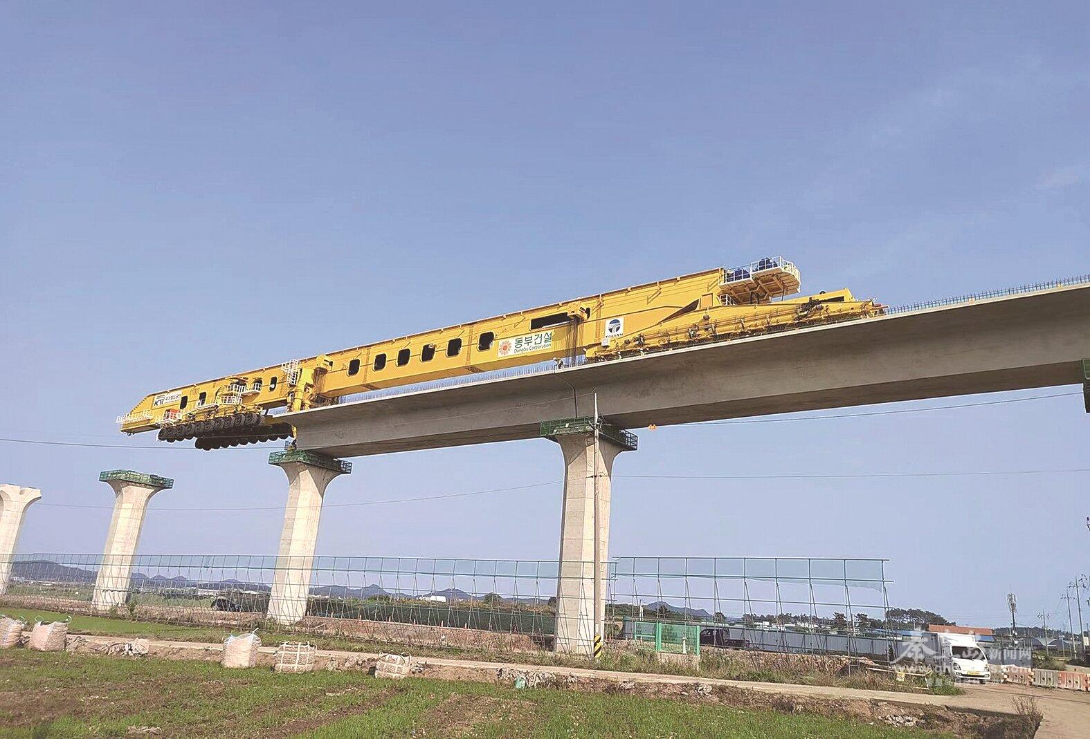 秦皇島天業(yè)通聯(lián)重工科技有限公司自主研發(fā)的架橋機(jī)在韓國(guó)湖南高速鐵路二期項(xiàng)目工地進(jìn)行架設(shè)作業(yè)。 (圖片由秦皇島天業(yè)通聯(lián)重工科技有限公司提供)