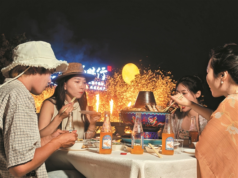 游客邊品嘗渾鍋美食邊觀看《身向榆關(guān)那畔行》實(shí)景劇。