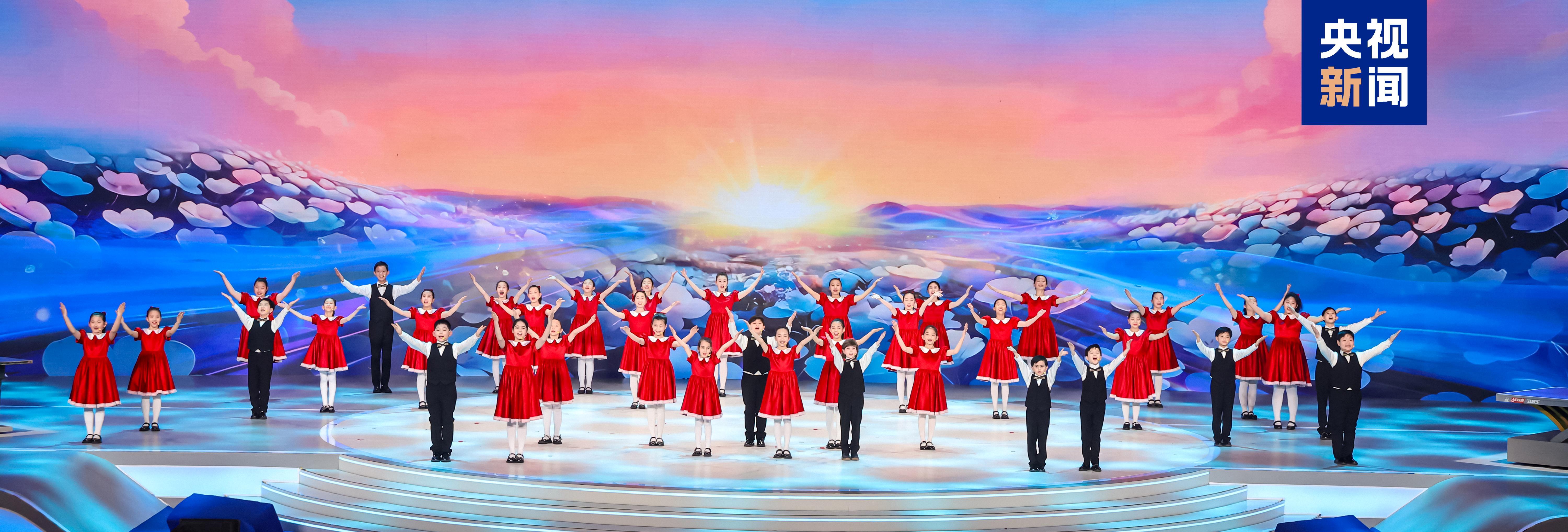 △中美“乒乓外交”55周年紀念大會上,中美青少年合唱歌曲《銀球飛舞花盛開》。