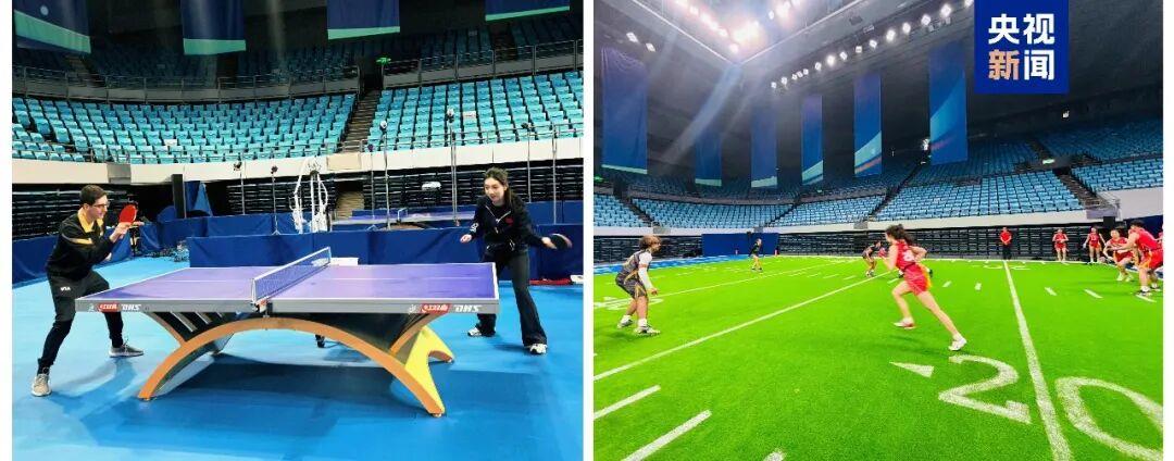 △中美“乒乓外交”55周年紀念大會現(xiàn)場,中美乒乓球與橄欖球跨項目互動體驗。